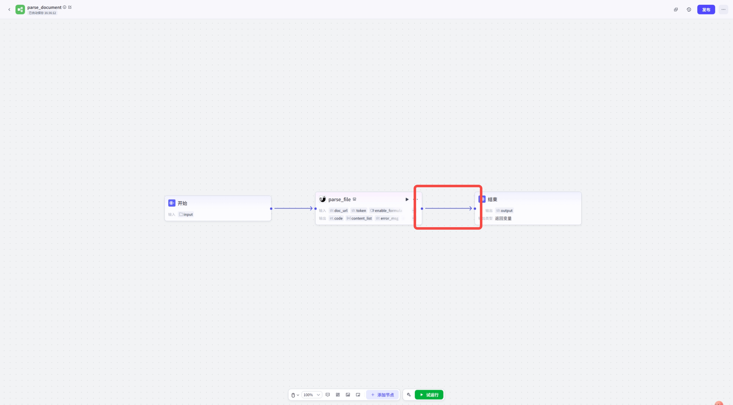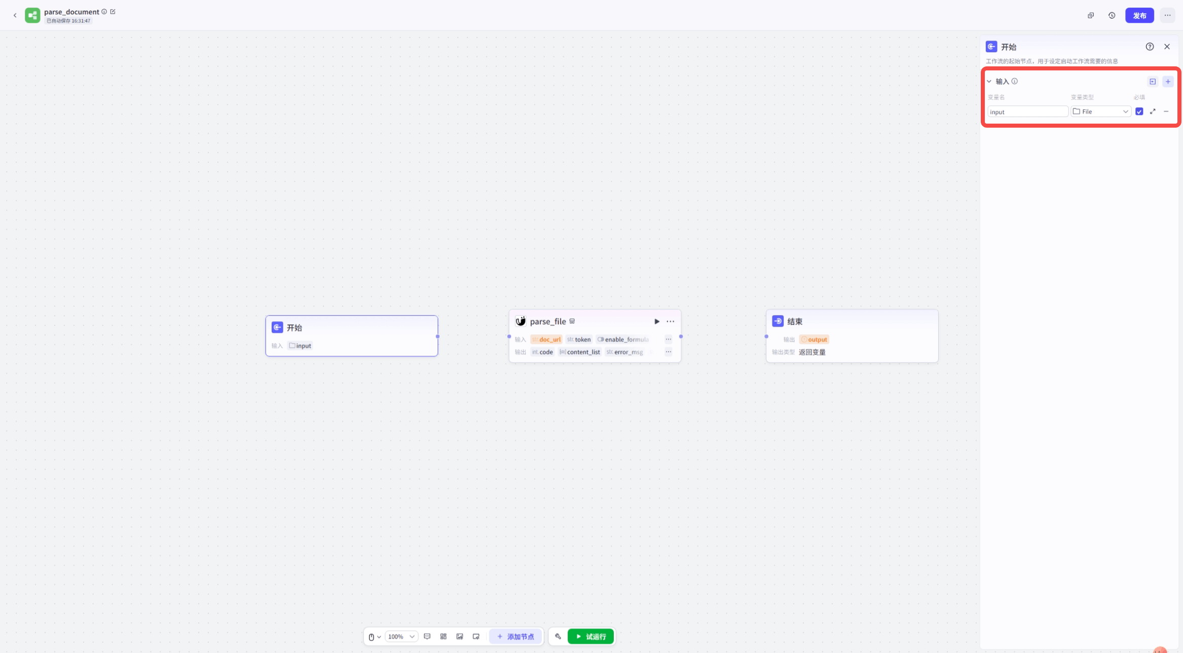 +#### 第三步:添加工具节点——MinerU插件来解析上一步开始节点上传的文件