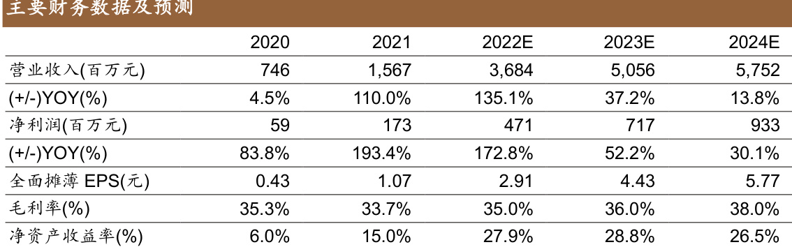 -<table><tr><th>主要财务数据及预测</th><th colspan='5'></th></tr><tr><td></td><td>2020</td><td>2021</td><td>2022E</td><td>2023E</td><td>2024E</td></tr><tr><td>营业收入(百万元)</td><td>746</td><td>1,567</td><td>3,684</td><td>5,056</td><td>5,752</td></tr><tr><td>( +/-YOY(\%)</td><td>4.5\%</td><td>110.0\%</td><td>135.1\%</td><td>37.2\%</td><td>13.8\%</td></tr><tr><td>净利润(百万元)</td><td>59</td><td>173</td><td>471</td><td>717</td><td>933</td></tr><tr><td>( +/-YOY(\%)</td><td colspan='2'>83.8\%</td><td>193.4\%</td><td>52.2\%</td><td>30.1\%</td></tr><tr><td>全面摊薄EPS(元)</td><td>0.43</td><td>1.07</td><td>2.91</td><td>4.43</td><td>5.77</td></tr><tr><td>毛利率(\%)</td><td>35.3\%</td><td>33.7\%</td><td>35.0\%</td><td>36.0\%</td><td>38.0\%</td></tr><tr><td>净资产收益率(\%)</td><td>6.0\%</td><td>15.0\%</td><td>27.9\%</td><td>28.8\%</td><td>26.5\%</td></tr></table>
