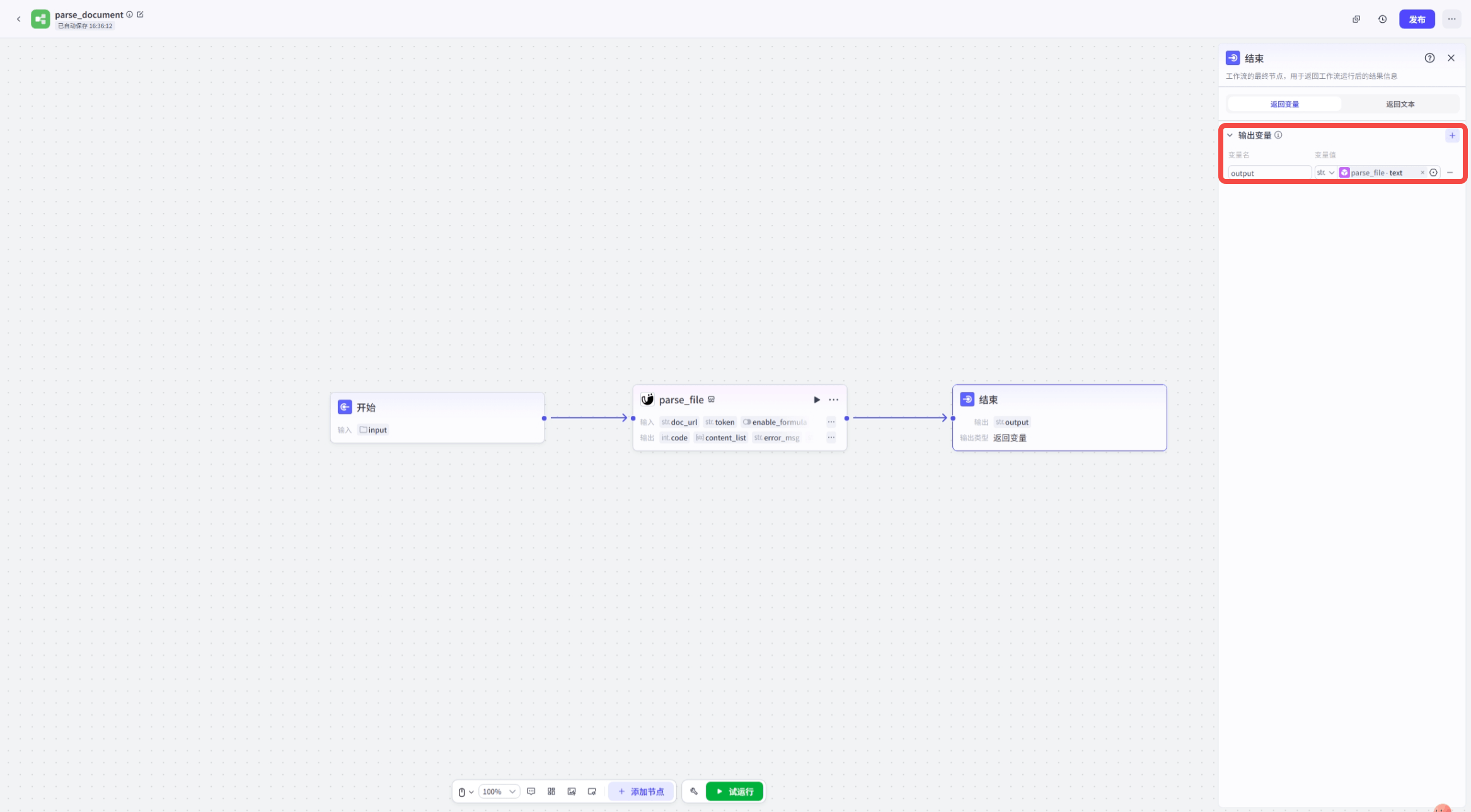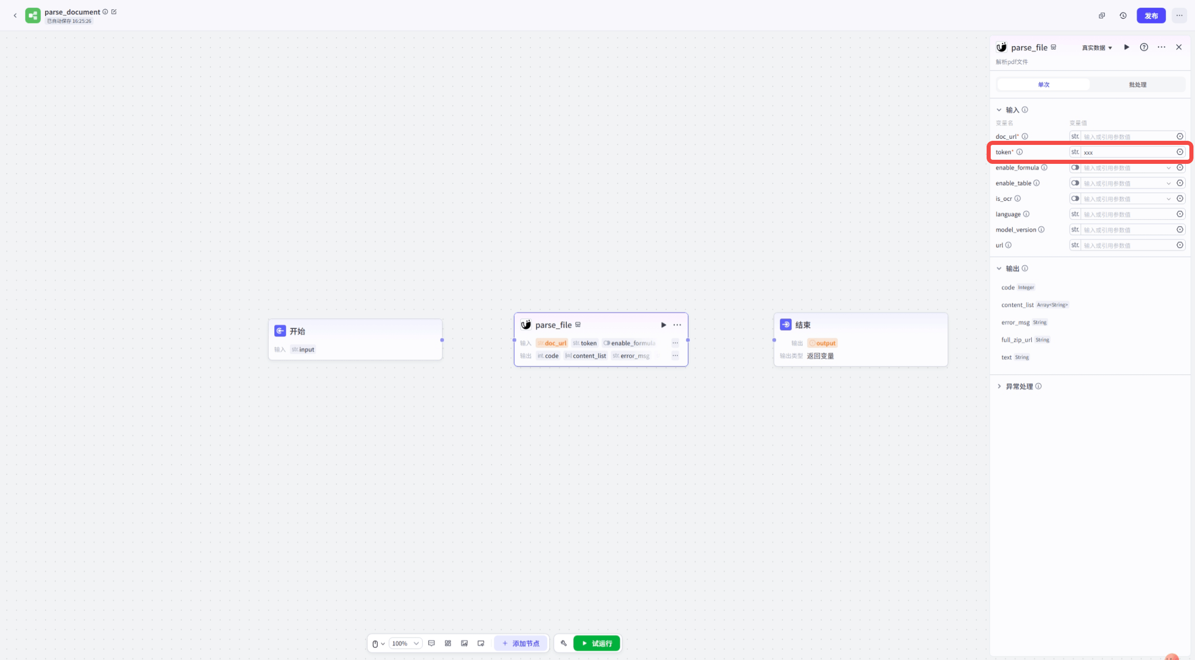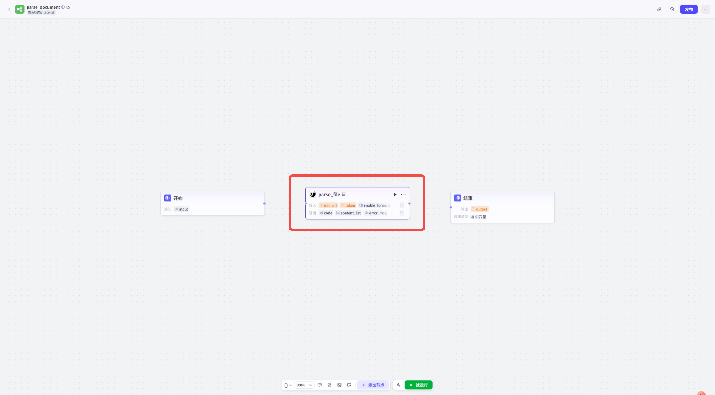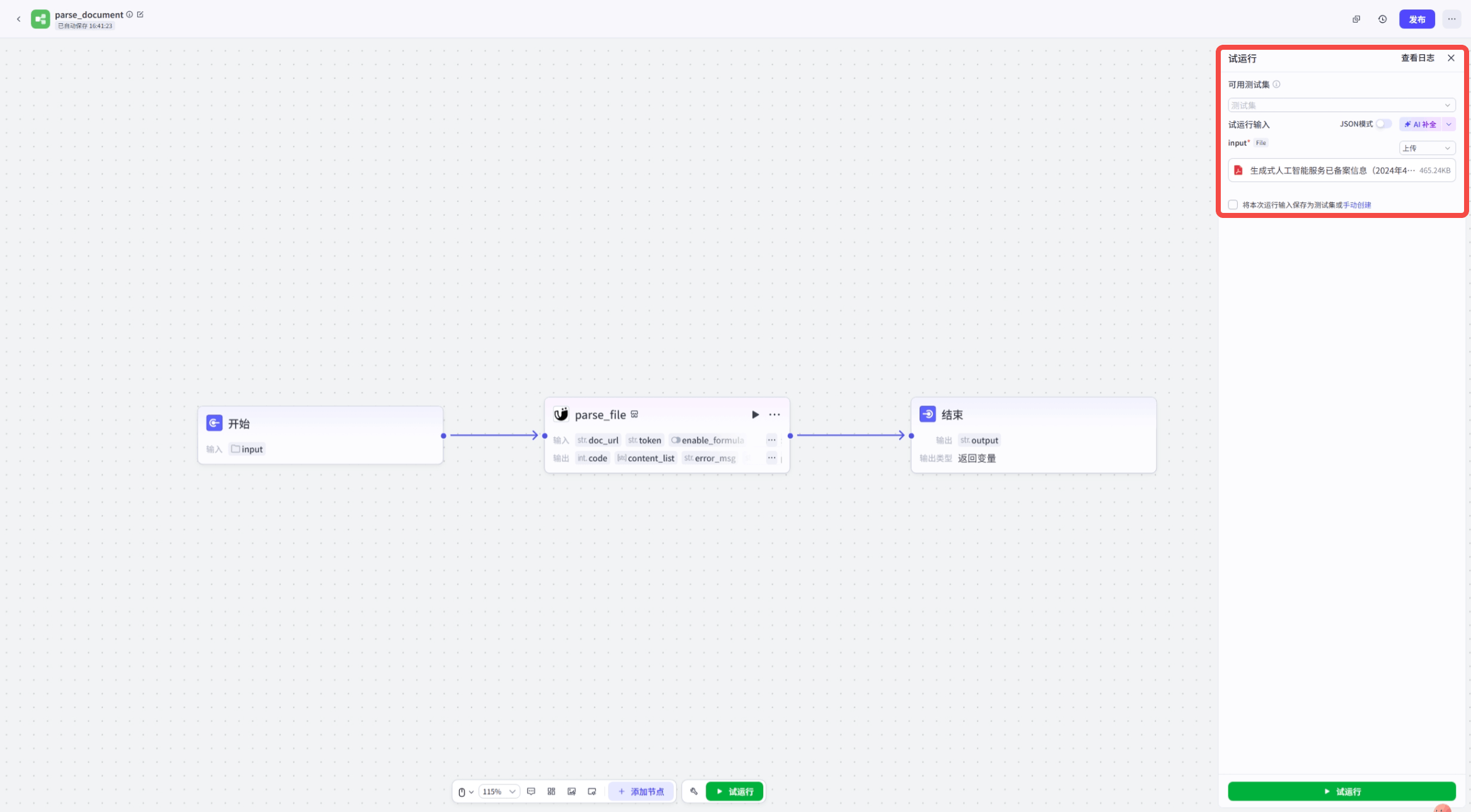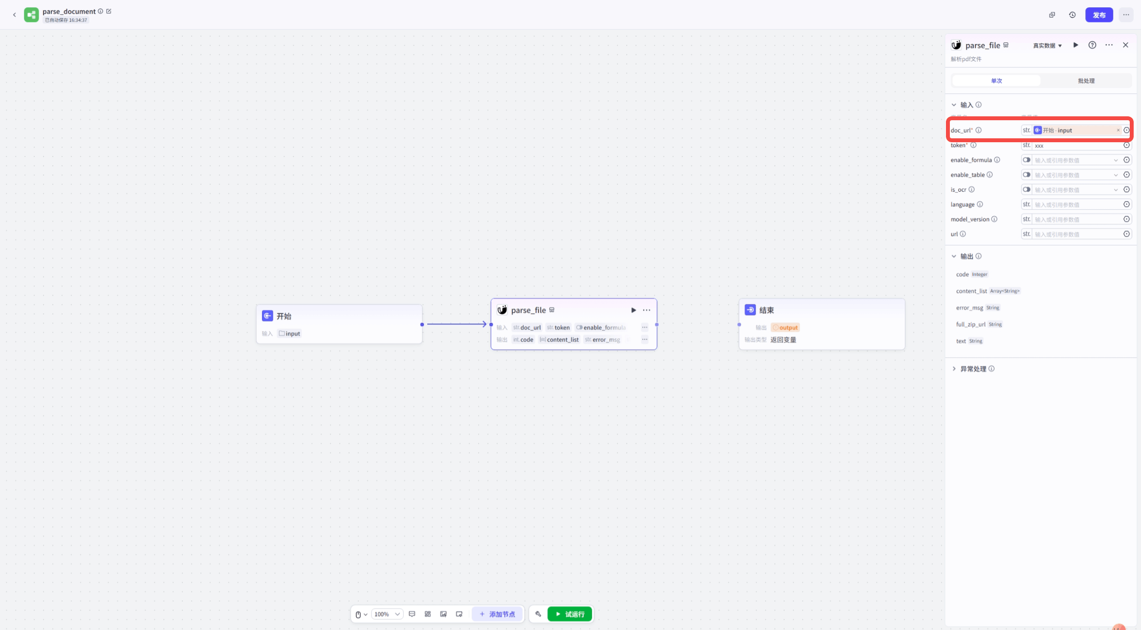 +#### 第三步:添加工具节点——MinerU插件来解析上一步开始节点上传的文件
