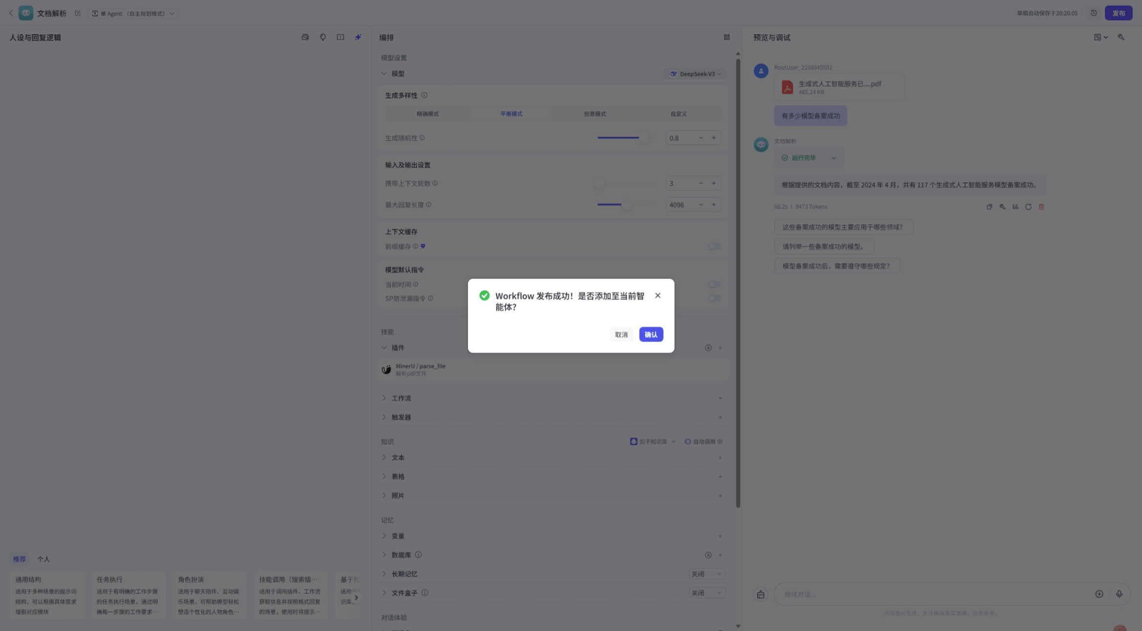 +保存并发布你的应用。现在,上传一份PDF或图片,你就可以和它自由对话了!