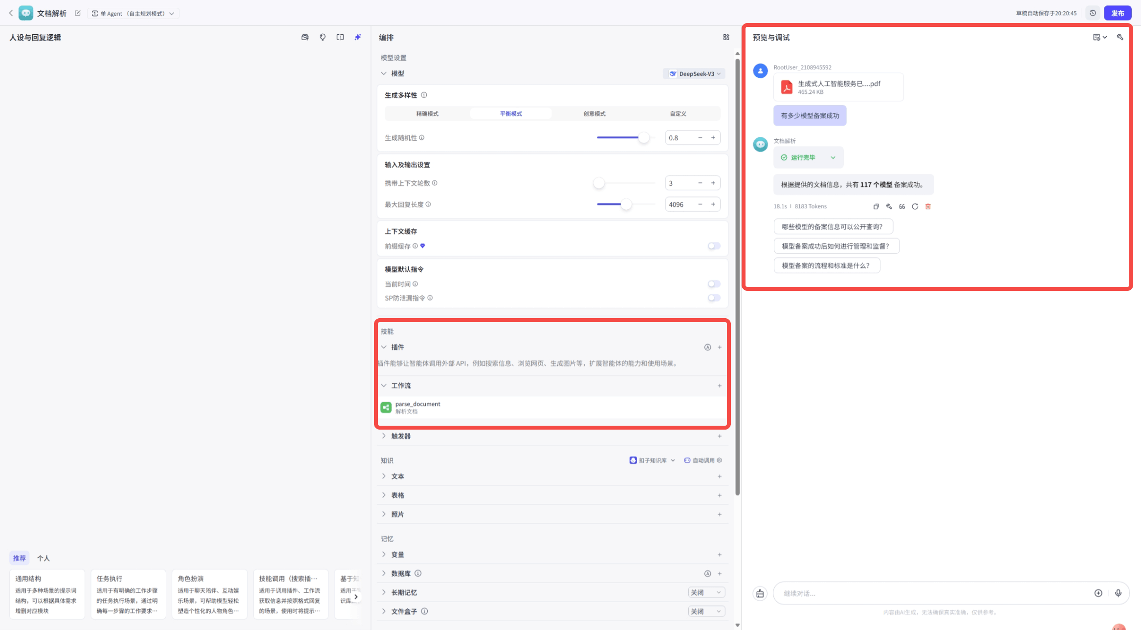 +#### 第六步:预览,上传文件并提问机器人关于文档的内容