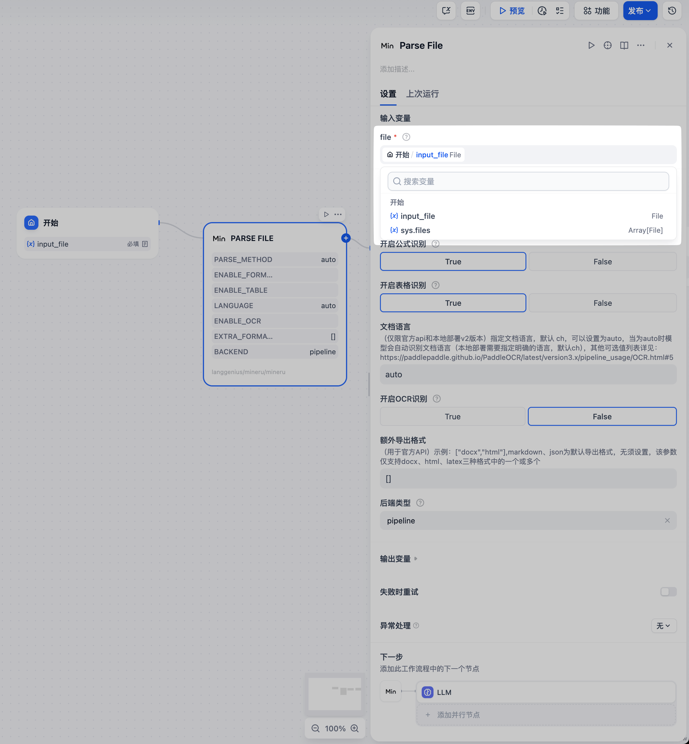 +#### 第四步:设置MinerU的输入变量,选择上一步开始节点添加的 `input_file`
