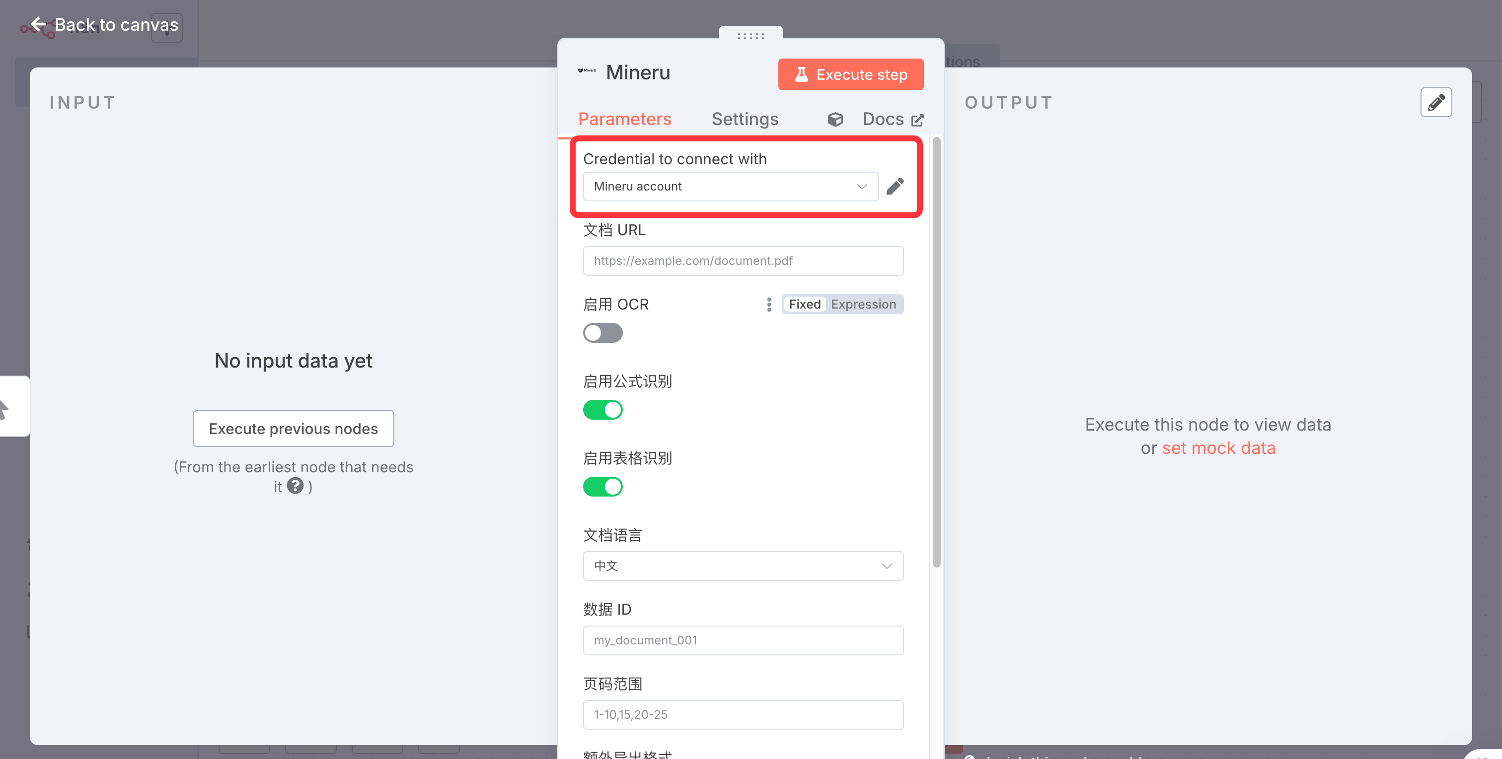 step3 新建工作流,添加 n8n-nodes-mineru 节点,并设置 api key
