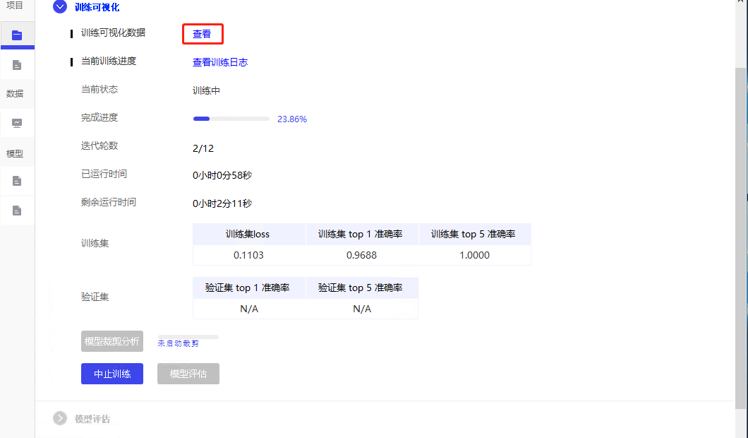 +模型训练结束后,可选择进入『模型剪裁分析』或者直接进入『模型评估』。