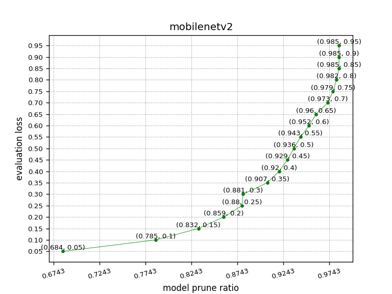 +纵轴为`eval_metric_loss`(接下来第三步需要配置的参数),横轴为模型被裁剪的比例,从图中可以看到,