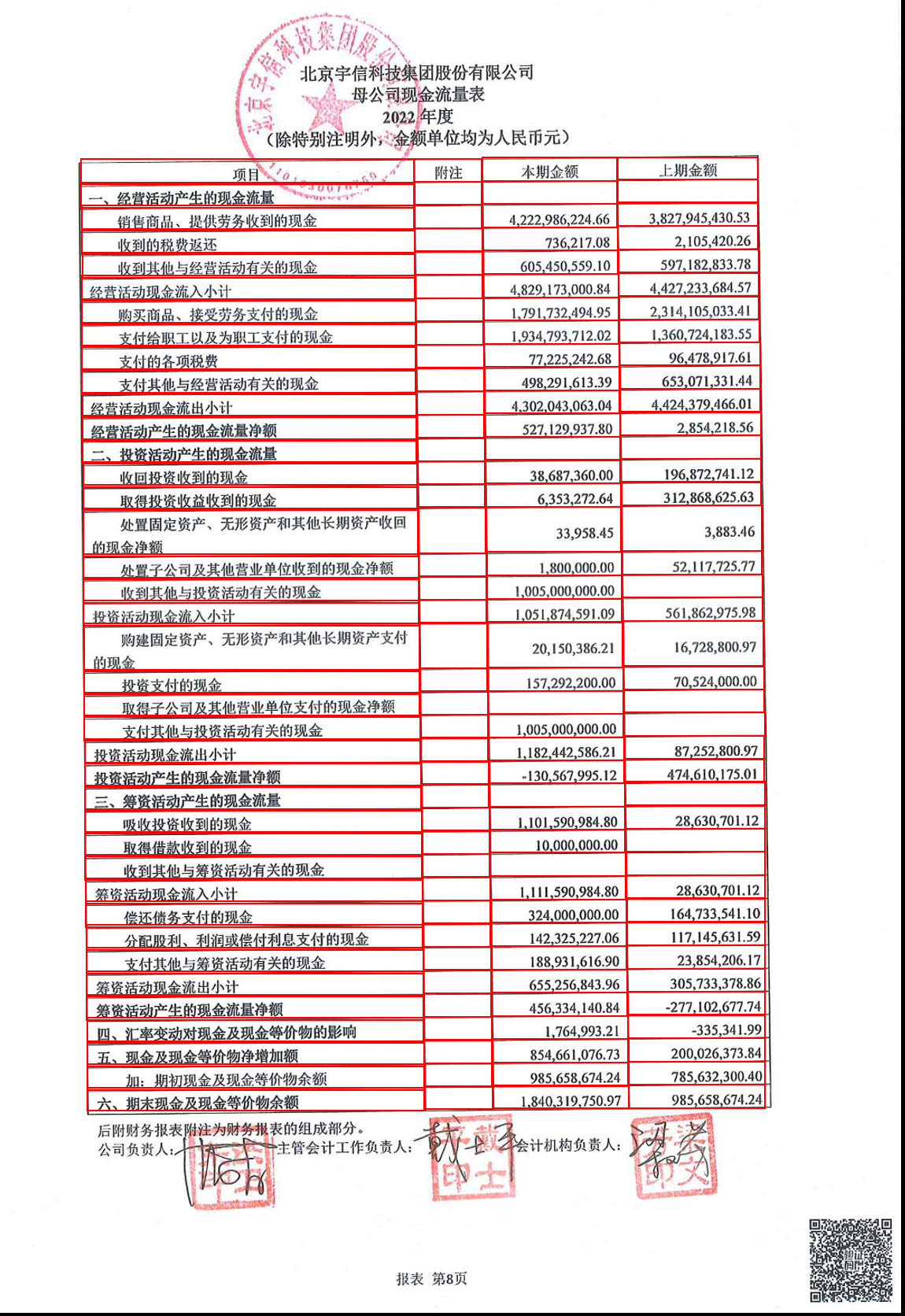 +    "result": "项目 | 附注 | 本期金额 | 上期金额\n**一** | **2022年**<br>• 经营活动产生的现金流量 | **4,222,986,224.66**<br>3,827,945,430.53 | **736,217.08**<br>2,105,420.26\n**二** | **2022年**<br>• 收到其他与经营活动有关的现金 | **605,450,559.10**<br>597,182,833.78 | **736,217.08**<br>2,115,420.26\n**三** | **2022年**<br>• 经营活动现金流入小计 | **4,829,173,000.84**<br>4,442,273,233.6847 | **7,191,732,494.95**<br>2,314,105,033.41\n**四** | **2022年**<br>• 2022年**<br>1,394,793,712.02<br>1,360,724,183.55 | **1,394,793,712.02**<br>1,360,724,183.55 | **77,225,242.68**<br>964,789,716.61\n**五** | **2022年**<br>• 2022年 **<br>1,394,793,712.02**<br><br>**498,291,613.39**<br>5,053,071,331.44\n**六** | **2022年**<br>• 经营活动现金流出小计 | **4,302,043,063.04**<br>4,424,379,466.01 | **725,129,937.80**<br>2,854,218.56\n**九** | **2022年**<br>• 2022年 (未标明) | **38,687,360.00**<br>196,872,741.12 | **312,868,625.63**\n**四** | **2022年**<br>• 2021年**<br>1,005,000,000.00 | **1,051,874,591.09**<br>561,862,975.98 | **20150,386.21**<br>1,6728,800.97\n**五** | **2022年**<br>• 2015年**<br>1,579,292,200.00 | **157,292,200.00**<br>70,524,000.00 | **1,005,000,000.00 | **1005,000,000.00)\n**六** | **2022年**<br>• 2015年 (未标明) | **1,005,000,000.00**<br>87,275,280.997 | **182,442,586.21**<br>87,275,280.997\n**五** | **2022年**<br>• 1015年**<br>1,30,567,"