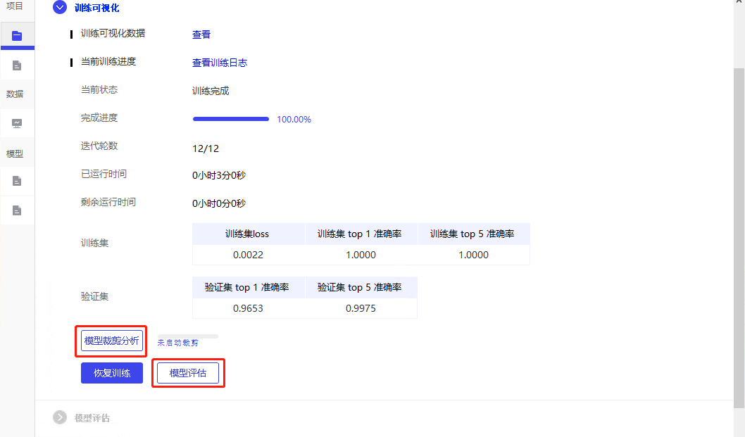 +模型训练结束后,可选择进入『模型剪裁分析』或者直接进入『模型评估』。