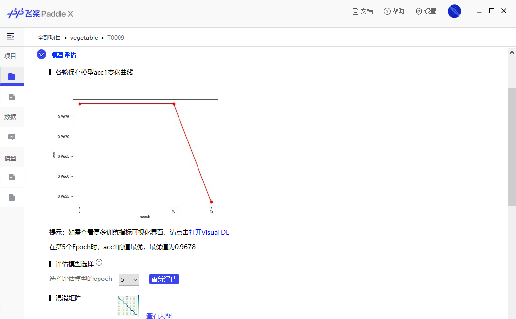 +⑤ **模型评估**:在模型评估页面,您可查看训练后的模型效果。评估方法包括混淆矩阵、精度、召回率等。