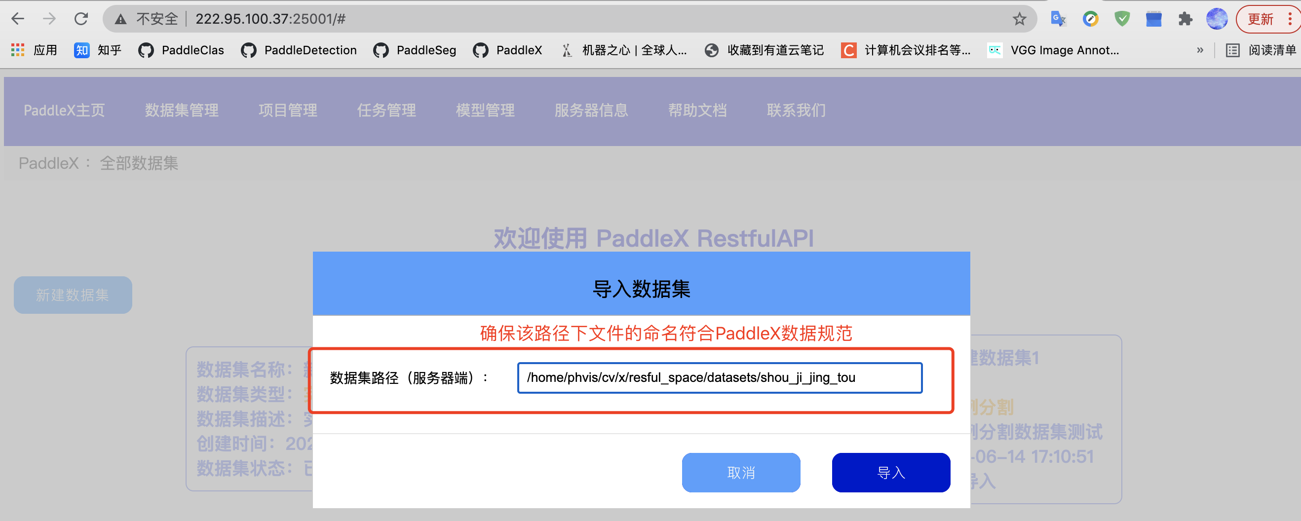 +输入在服务上数据存储的路径,开始导入数据,在服务器上传的数据集,必须是符合PaddleX训练数据的命名格式要求。