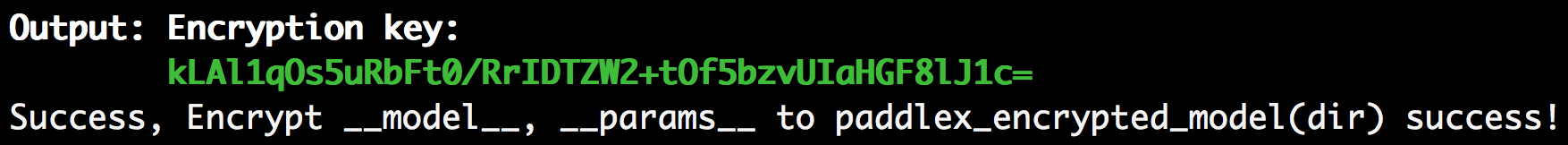 +`-model_dir`用于指定inference模型路径(参考[导出inference模型](python.html#inference)将模型导出为inference格式模型),可使用[导出小度熊识别模型](python.html#inference)中导出的`inference_model`。加密完成后,加密过的模型会保存至指定的`-save_dir`下,包含`__model__.encrypted`、`__params__.encrypted`和`model.yml`三个文件,同时生成密钥信息,命令输出如下图所示,密钥为`kLAl1qOs5uRbFt0/RrIDTZW2+tOf5bzvUIaHGF8lJ1c=`