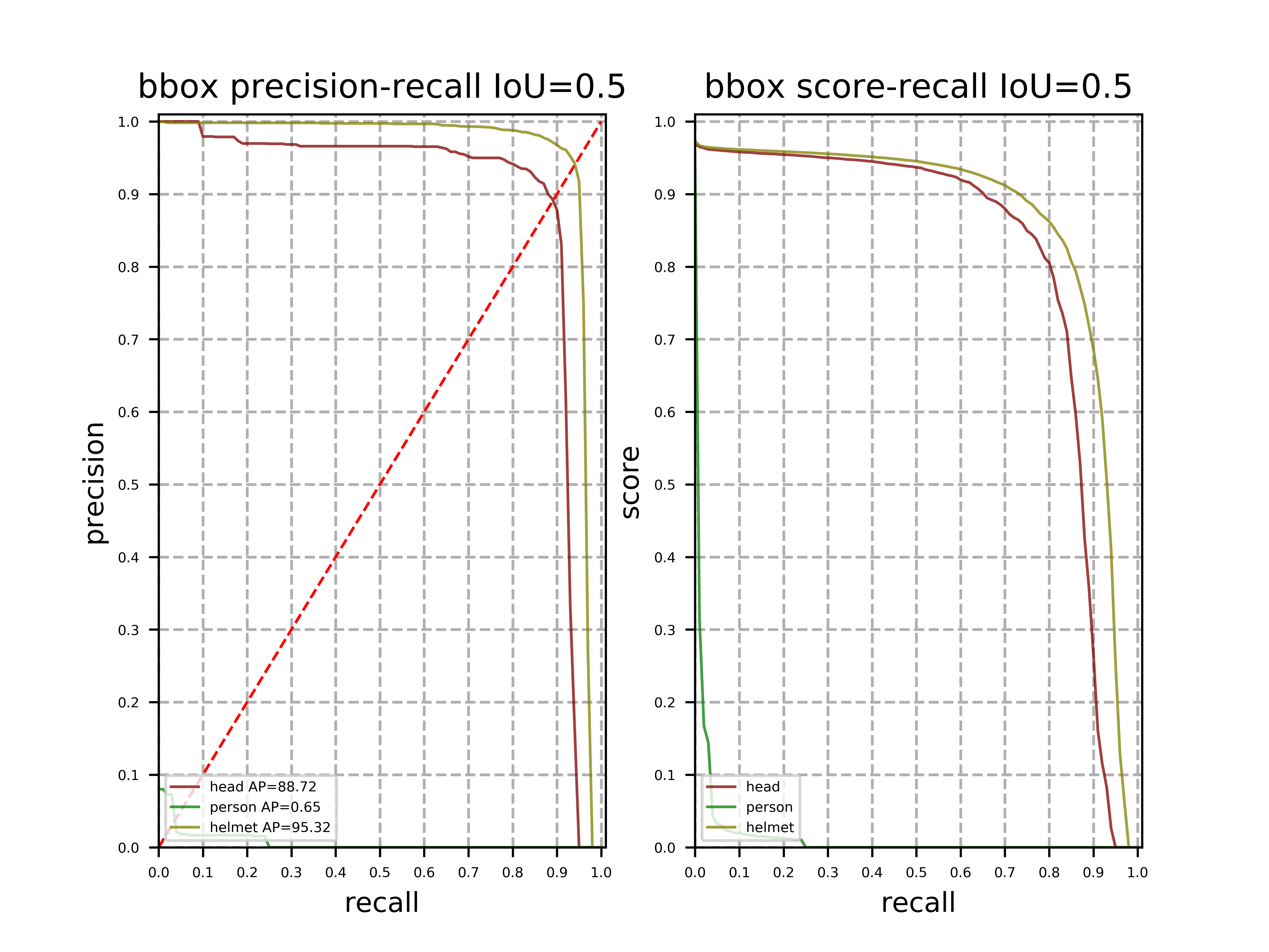 在本项目中的安全帽检测数据中,标注信息本身存在一定的缺漏,导致部分类别学习失效。但针对本项目的安全帽检测问题而言,**person(人)这一类别影响不大,因此可以在mmap较大的基础上主要看helmet(安全帽)的精度即可**。通过**COCO的评估指标**,可以使多类别的检测模型的评估更加符合实际应用;虽然我们可以看出在该数据集中,有一个类别对整体的map与mmap有较大影响,但是通过COCO指标能够取得一个相对数据集更**综合表现**(不同Iou尺度下)的一个模型。