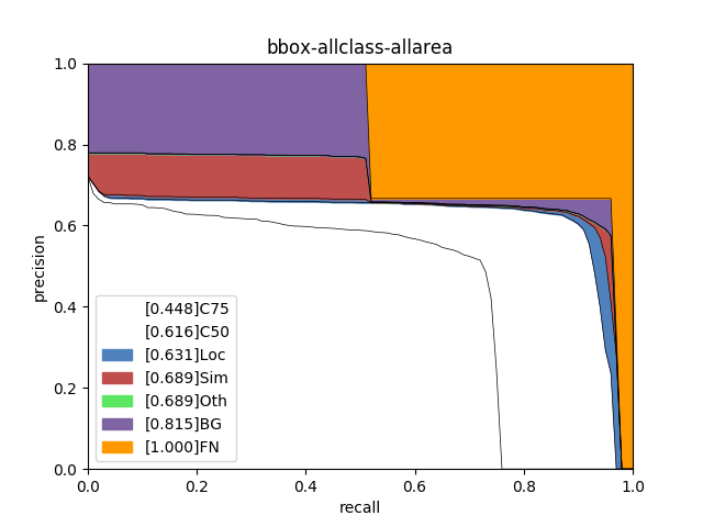 - BG: 在Oth的基础上,背景区域上的检测框不认为是错误的,在这种评估要求下的PR曲线,AP为0.970。BG与Oth之间的紫色区域面积越大,表示背景区域被误检的数量越多。
