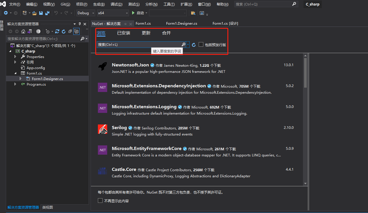 * 用户选择Debug X64模式进行调式 * 用户在使用预测之前需要自行下载opencvsharp 方式:工具-NuGet包管理工具器,选择搜索下载opencvcharp