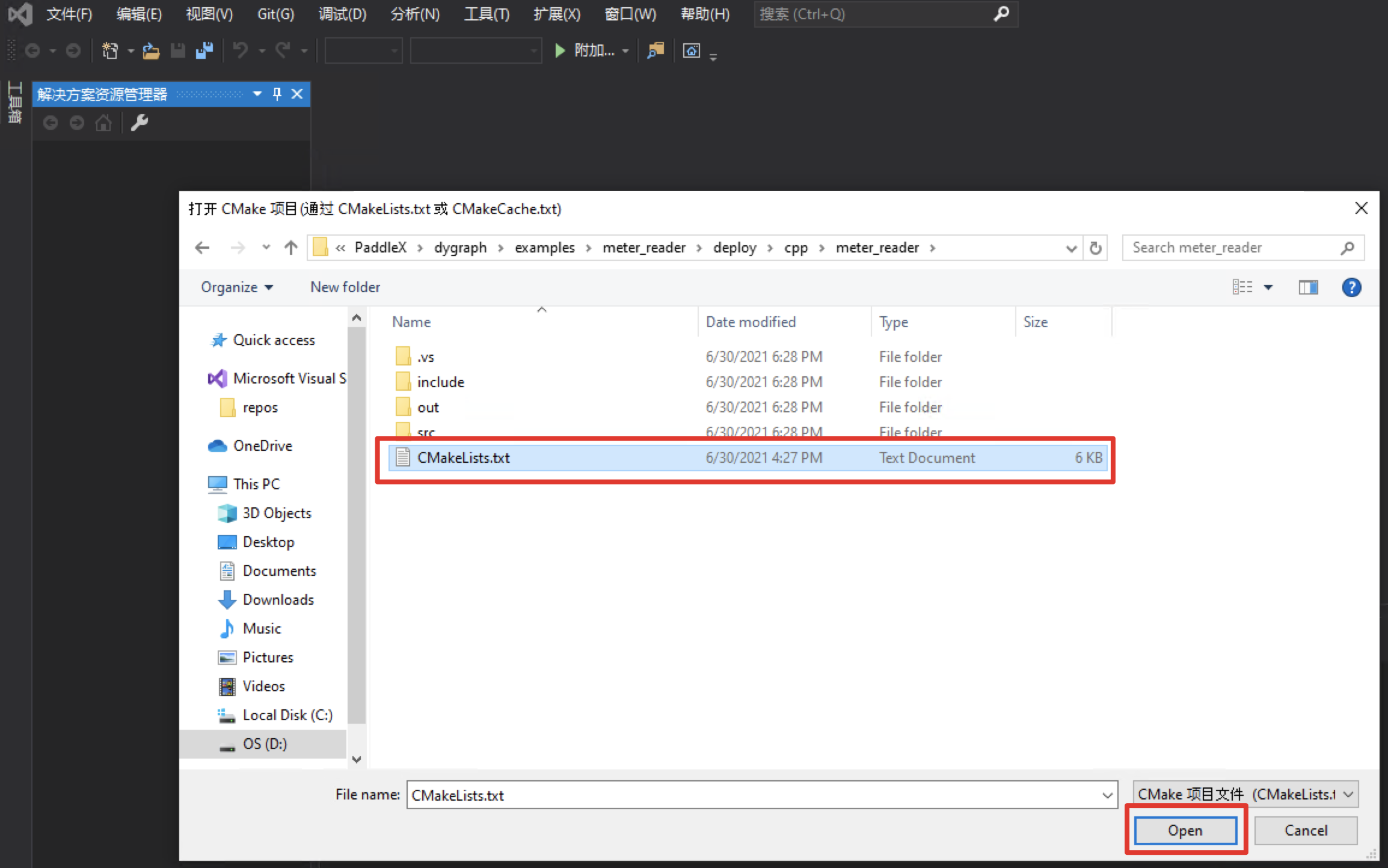 D:\projects\opencvD:\projects\opencv\build\x64\vc15\binD:\projects\TensorRT-7.0.0.11选择表计读数C++预测代码所在路径(例如D:\projects\PaddleX\examples/meter_reader/deploy/cpp/meter_reader),并打开CMakeList.txt: