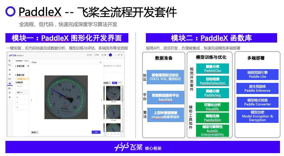 集成飞桨智能视觉领域图像分类、目标检测、语义分割、实例分割任务能力,将深度学习开发全流程从数据准备、模型训练与优化到多端部署端到端打通,并提供统一任务API接口及图形化开发界面Demo。开发者无需分别安装不同套件,以低代码的形式即可快速完成飞桨全流程开发。
