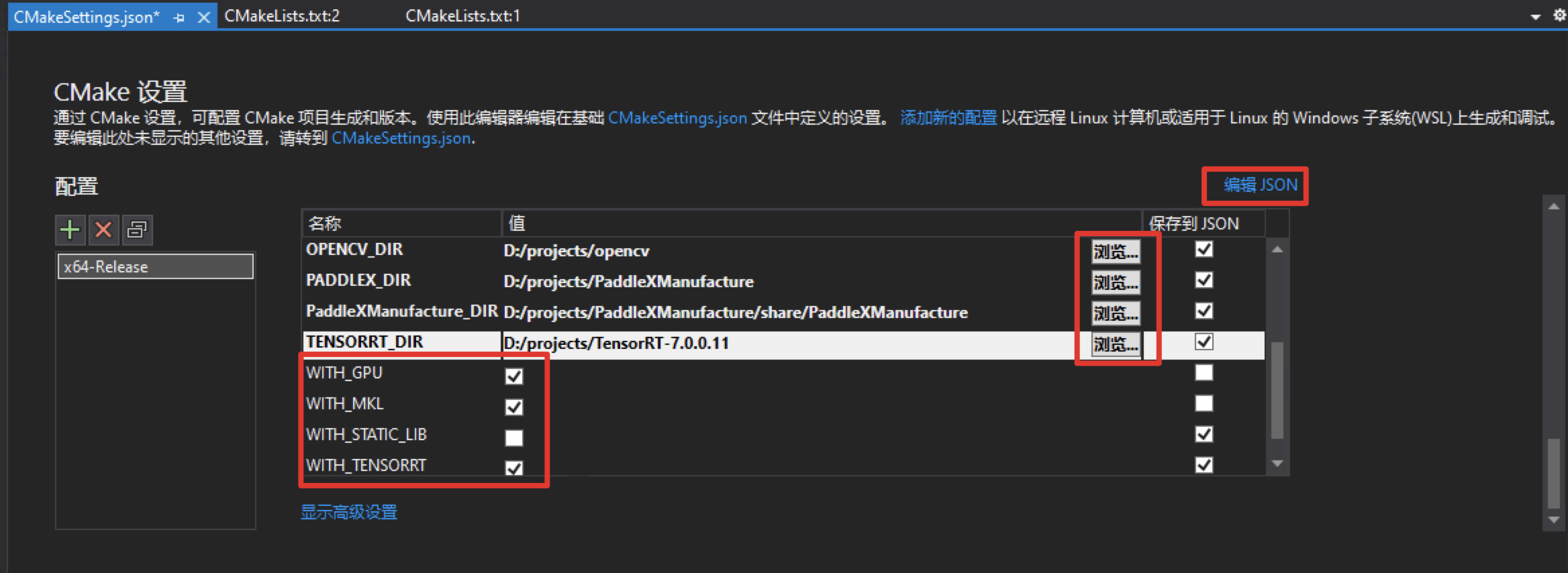 浏览,分别设置编译选项指定CUDA、OpenCV、PaddleXManufacture、TensorRT的路径(也可以点击右上角的“编辑 JSON”,直接修改json文件,然后保存点 项目->生成缓存)