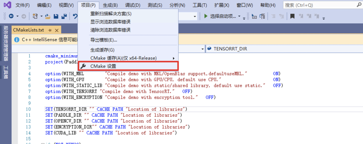 D:\projects\opencvD:\projects\opencv\build\x64\vc14\bin继续但无需代码文件->打开->CMake选择C++预测代码所在路径(例如D:\projects\PaddleX\deploy\cpp),并打开CMakeList.txt: