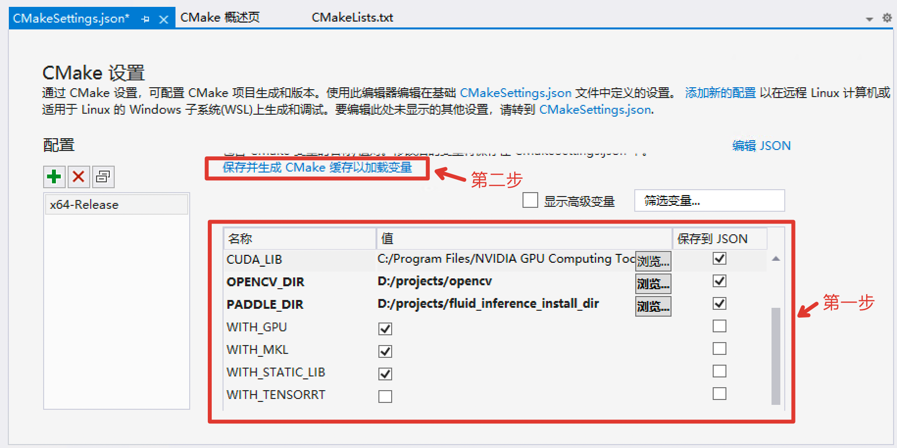 CPU版预测库,请把WITH_GPU的值去掉勾openblas版本,请把WITH_MKL的值去掉勾URL https://bj.bcebos.com/paddlex/deploy/deps/yaml-cpp.zip 中的网址,改为下载文件的路径。设置完成后, 点击上图中保存并生成CMake缓存以加载变量。